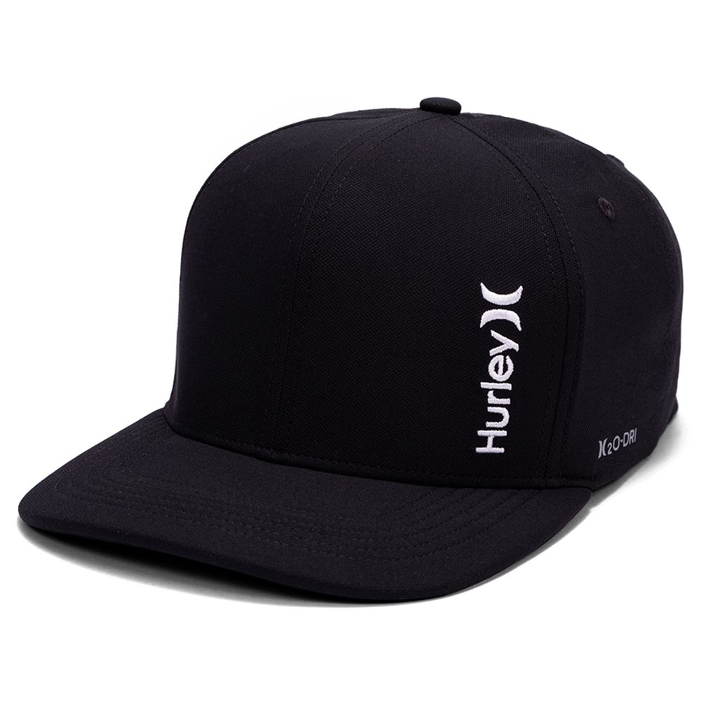 Produto importado Modelo aba curva Tecido tecnológico H2O-DRI Perfuração a laser nas laterais Bordados exclusivos Hurley 'Born From Water' Fechamento snapback com regulador Etiqueta bandeira One&Only Heat Transfer lateral refletivo |